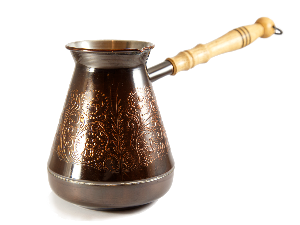Мідна турка з дерев'яною ручкою. Вона має вузьке горло, що важливо для збереження аромату кави. Усередині турки покриті харчовим оловом, яке захищає мідь від окиснення й робить використання турки безпечним для здоров'я. Мідь має рівномірну теплопровідність, що дає змогу приготувати смачну каву.Товщина міді 1 мм, олова 9-12 мкм. Мідні турки найбільш довговічні та невибагливі.